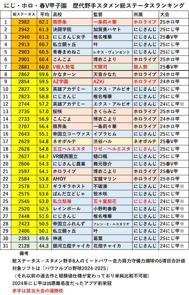 パワプロ24-25で開催された栄冠大会での野手総ステランキングです
