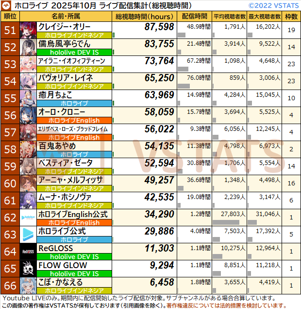 Vtuberのデータ集計サイトVSTATS(https://vstats.jp )より、ホロライブ 2025年10月のYoutube LIVEにおけるライブ配信集計(総視聴時間順)です。